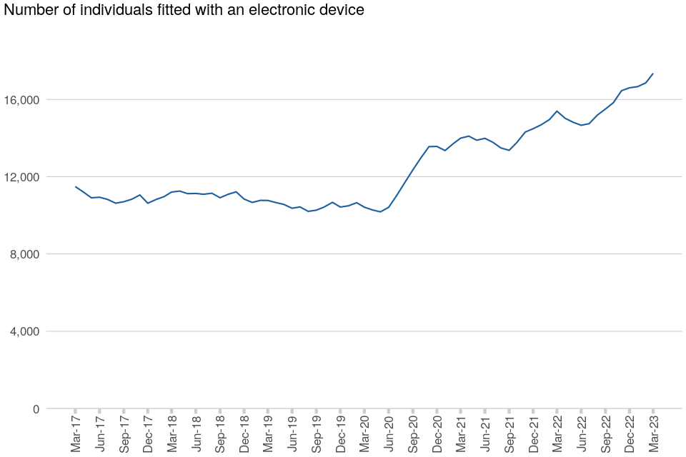 At 31 March 2023, the total number of individuals fitted with an electronic monitoring device (a radio frequency device for Home Detention Curfews or location device) or an alcohol monitoring device was 17,350, an increase of 13% compared with 31 March 2022. Although the monthly figures fluctuate, the trend over the 12-month period has been upwards.