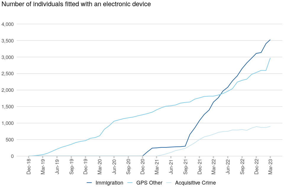 Between 31 March 2022 and 31 March 2023 the number of individuals fitted with an electronic monitoring device and whose primary order was a GPS order increased from 4,110 people to 7,398. Over the same period the proportion of individuals whose primary order was a GPS order increased from 27% to 43%. This increase in the numbers and relative use of GPS tags is the result of expanding the use of electronic monitoring to new offender cohorts, particularly immigration bail. As at 31 March 2023 GPS immigration bail accounted for 48% of all individuals whose primary order was a GPS order.