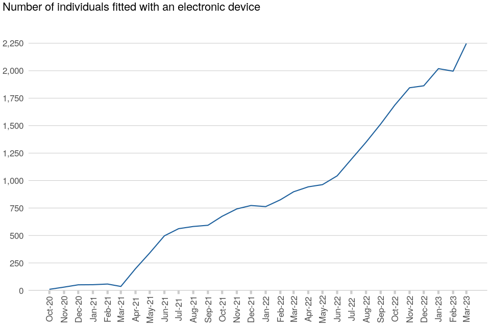 | The number of individuals fitted with an electronic monitoring device increased by 13% | At 31 March 2023, the total number of individuals fitted with an electronic monitoring device was 17,350, an increase of 13% from 15,394 as at 31 March 2022. |