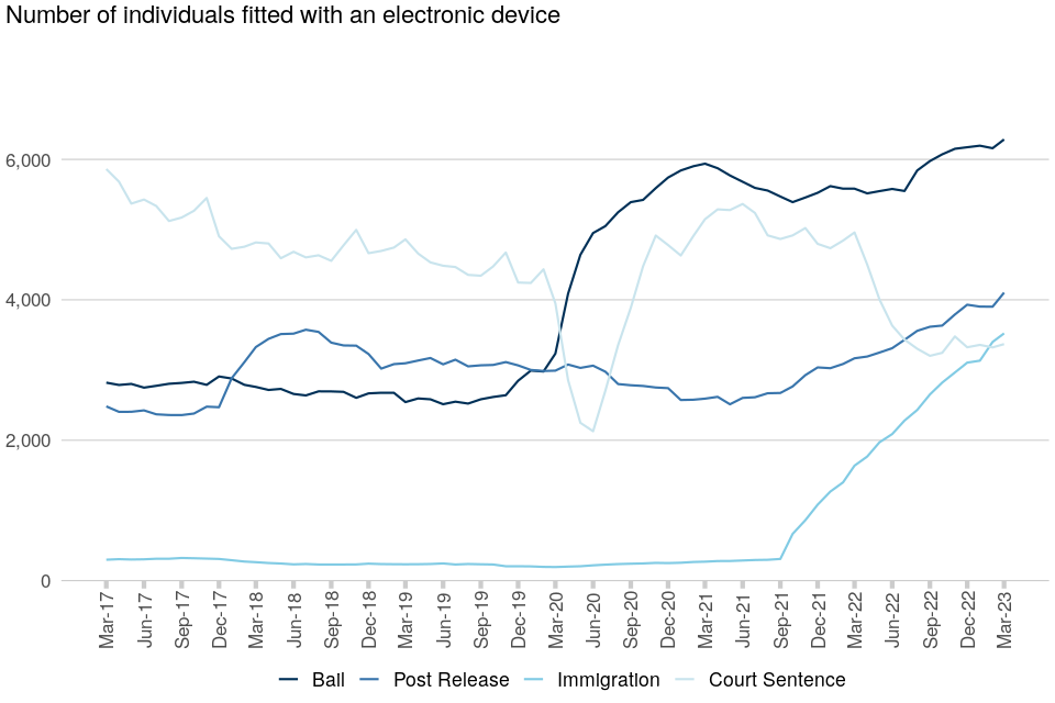 | Court bail orders remains the largest cohort of individuals fitted with an electronic monitoring device | The number of individuals fitted with an electronic monitoring device under a court bail order as at 31 March 2023 was 6,284, an increase of 13% from 5,583 as at 31 March 2022. Court bail accounted for 36% of all individuals fitted with an electronic monitoring device. |
