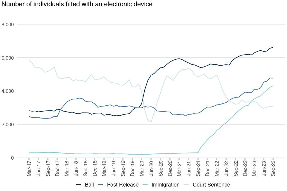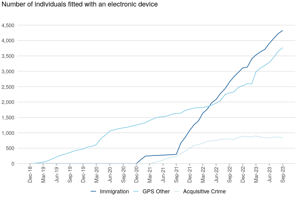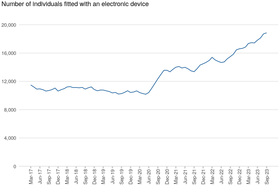 Between 30 September 2022 and 30 September 2023 the total number of individuals fitted with an electronic monitoring device (a radio frequency device or a location monitoring device) or an alcohol monitoring device increased from 15,504 people to 18,859, an increase of 22%.
