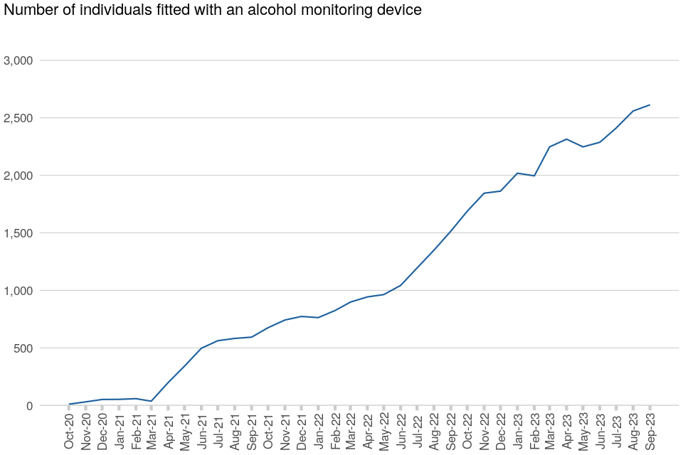 Between 30 September 2022 and 30 September 2023 the total number of individuals fitted with an alcohol monitoring device increased from 1,515 people to 2,614, an increase of 73%.