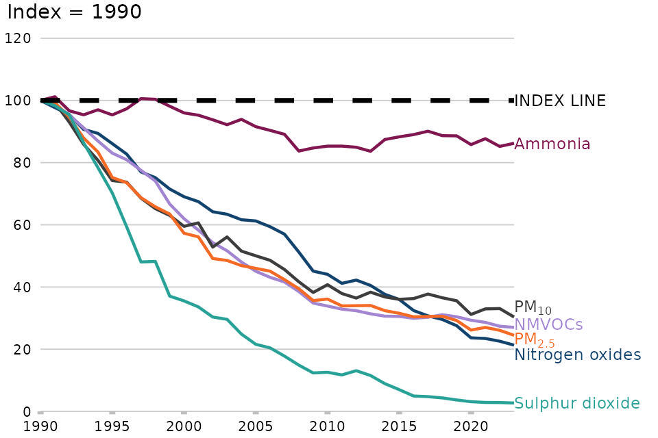 This section provides an overview of the information in the full publication. It contains statistics on annual emissions of six air pollutants which are key to air quality from 1990 to 2023. The data comes from the National Atmospheric Emissions Inventory which estimates emissions using internationally agreed methods and a wide range of survey and administrative data sources, from both inside and outside of government.