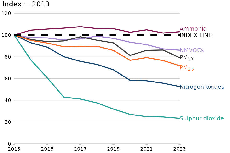 There has been a long-term decrease in estimated emissions of all of the air pollutants covered by this statistical release (ammonia, nitrogen oxides, non-methane volatile organic compounds, particulate matter (PM10, PM2.5) and sulphur dioxide). Estimated emissions of ammonia increased from 2022 to 2023, while estimated emissions of nitrogen oxides, non-methane volatile organic compounds, PM10, PM2.5 and sulphur dioxide fell from 2022 to 2023.