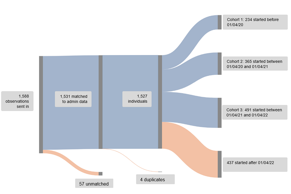 Figure 1 shows the numbers and reasons for course participant exclusions from the analysis. Primarily data was restricted to those who started on a programme before 1 April 2022 to ensure that one full year of employment follow-up data was available at the time of carrying out the analysis. This shows that most participants could be matched to the admin data and that of the excluded participants most were excluded because they started a course after 1 April 2022.