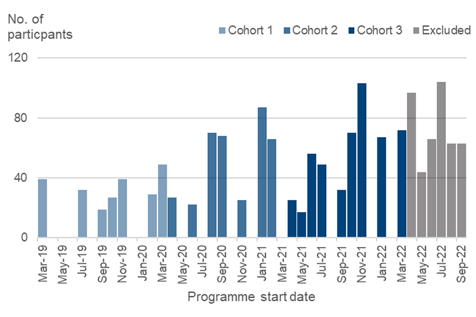The data includes participants who started on the programme before, during and in the wake of the COVID 19 pandemic. The pandemic and the associated lockdowns which took place between March 2020 and the Summer of 2021 had significant impacts on the UK labour market, with large swings in employment, unemployment, and inactivity rates[footnote 1]. To explore the impacts of the pandemic on the participants and their outcomes the data were split into 4 groups as follows: