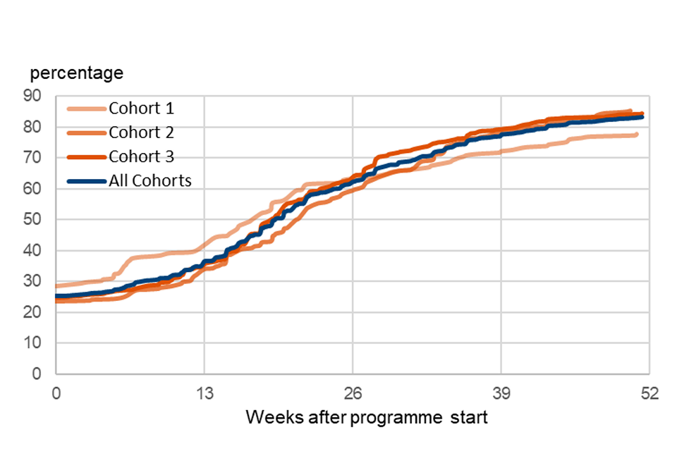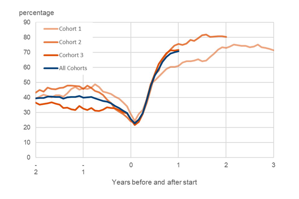 Figure 5 showing the percentage of people in each cohort entering employment (at least once) during the year after starting. People in the last cohort (cohort 3) appear to be finding work faster and at a higher rate than the other 2 cohorts.