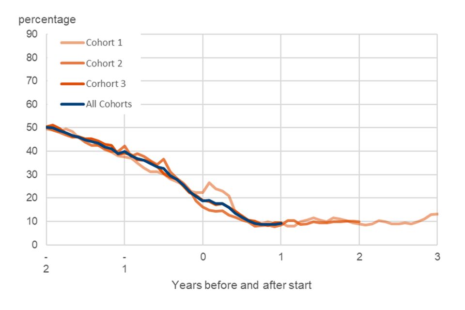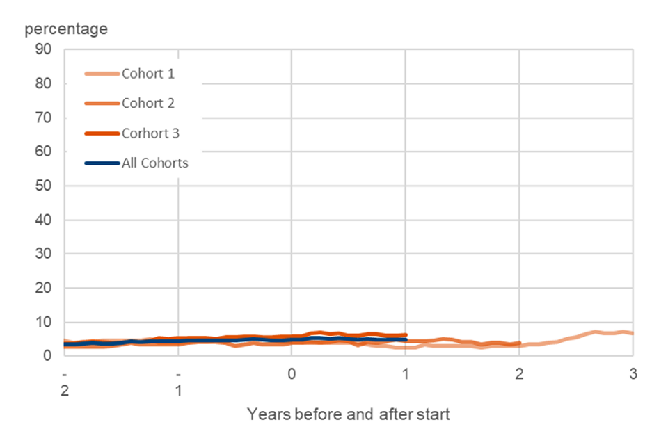 Figure 4 a) shows the percentage of each cohort in employment over the years before and after starting on the programme. The blue line shows the full group of all participants starting before April 2022. This shows a characteristic drop in employment rates as the line approaches the start of the programme, before picking up after people start. This is a common feature of employment programmes as the programmes are often aimed at those who are out of work. Similarly, in Figure 4 b), which shows the rates on a looking-for-work benefit, the line peaks around the point people start on the programme before falling away.