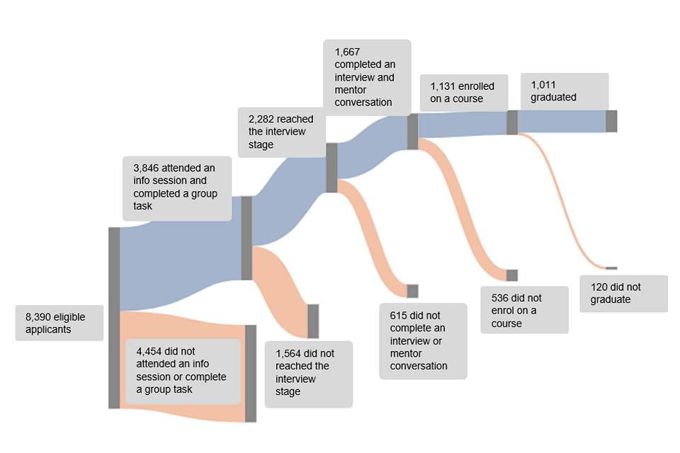 A key aim of the Employment Data Lab is to provide estimates of the causal impact of employment support programmes. Such an estimate has not been included in this report as the administrative data available was not deemed sufficient, by the Data Lab team, to fully control for the multi-stage, selection process that Generation’s participants must go through before joining the programme. The process is intensive, screening out approximately 87% of applicants over multiple assessment rounds. This decision is discussed further in appendix A. This report still provides useful information about the programme, its participants, and their outcomes.