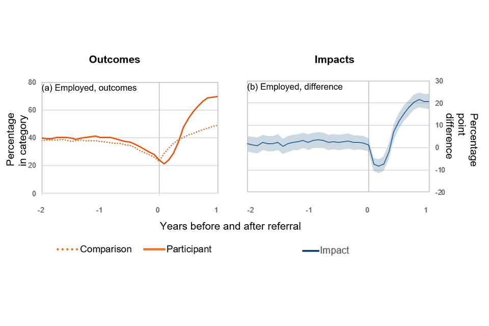 | Employed, at any point in the 2 years after start (%) | 91 | 95 | . | . |