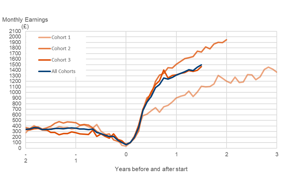 This table also shows differences in characteristics and histories between cohorts. One big difference between cohorts is in educational attainment. Of those who started between April 2020 and April 2021 (Cohort 2), 38% had passed a degree level course (level 6 or higher) before starting the programme. This is 15 percentage points higher than those who started before April 2020 (Cohort 1), and 15 percentage points higher than those who started after April 2021 (Cohort 3) (differences are calculated using unrounded percentages). These differences were statistically significant.