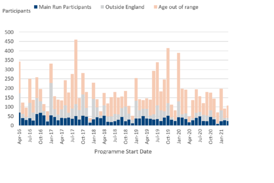 - The main analysis focuses on a sub-group of 2,193 individuals who participated in England between April 2016 and March 2021 and were between the ages of 18 and 30 when they started the programme. Scottish participants were not included in the main analysis due to data availability.