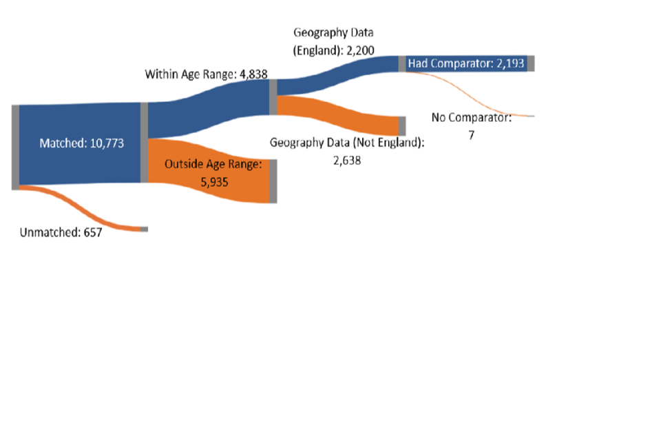 The comparison pool was selected from the Department for Education’s (DfE) administration data and was restricted to only include individuals who were in the same age range as the participants at the time of the programme start. This group was then randomly assigned a pseudo-start date in a way that matched the distribution of participant start dates. This group was then reduced further in several steps: