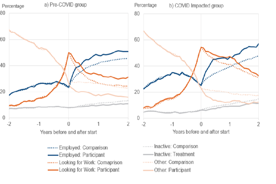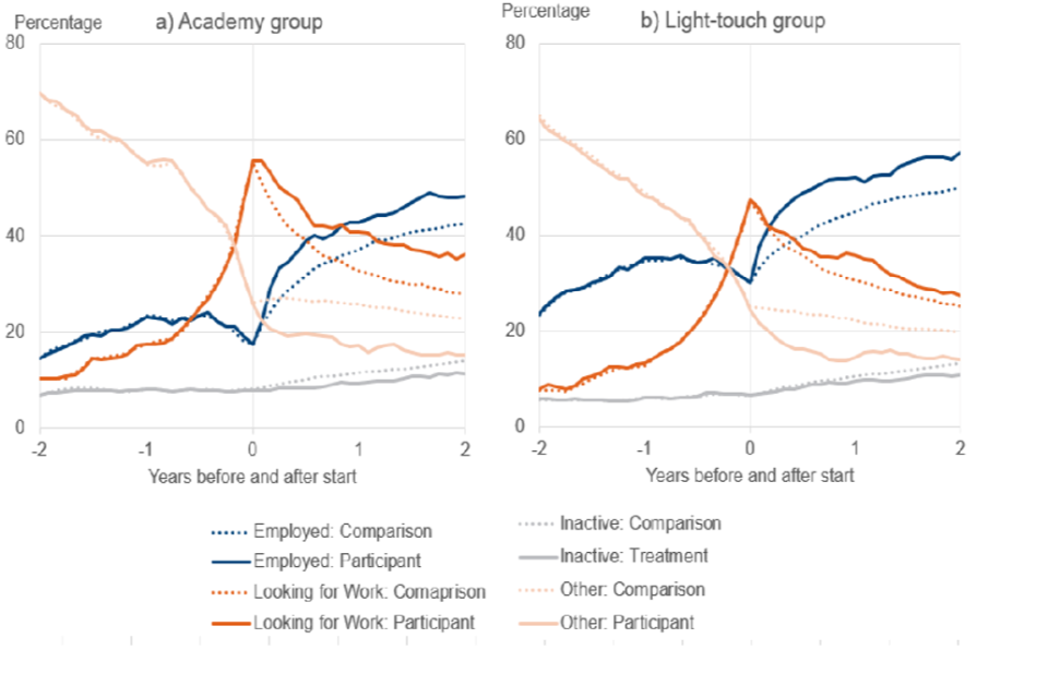 The solid lines show the participant group, and the dotted lines show the comparison group. The dark blue lines show the ‘Employed’ category, the dark orange lines show the ‘Looking for work’ category, the light blue lines show the ‘Inactive’ category, and the light orange lines show the ‘Other’ category.