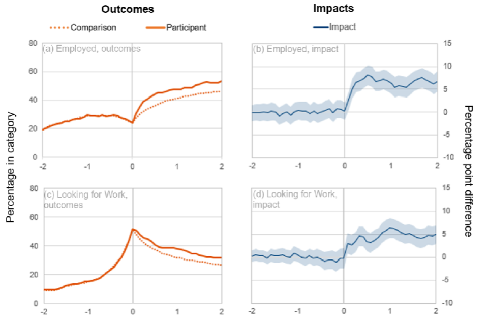Between 4 and 8 percentage points more participants were on a Looking for Work benefit 12 months after starting the programme, than had they not participated.