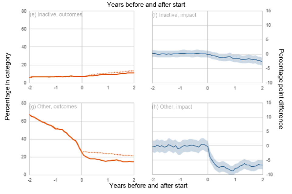 1(g and h) - Other: The impact plot (h) shows programmes led to a large and statistically significant decrease in the percentage of participants falling into the ‘other’ category in the twenty-four months following programme start. The outcome plot (g) shows the percentage of both groups classed as ‘other’ continued to decrease in the twenty-four months after start, with the rate of decrease being grater for the participant group.