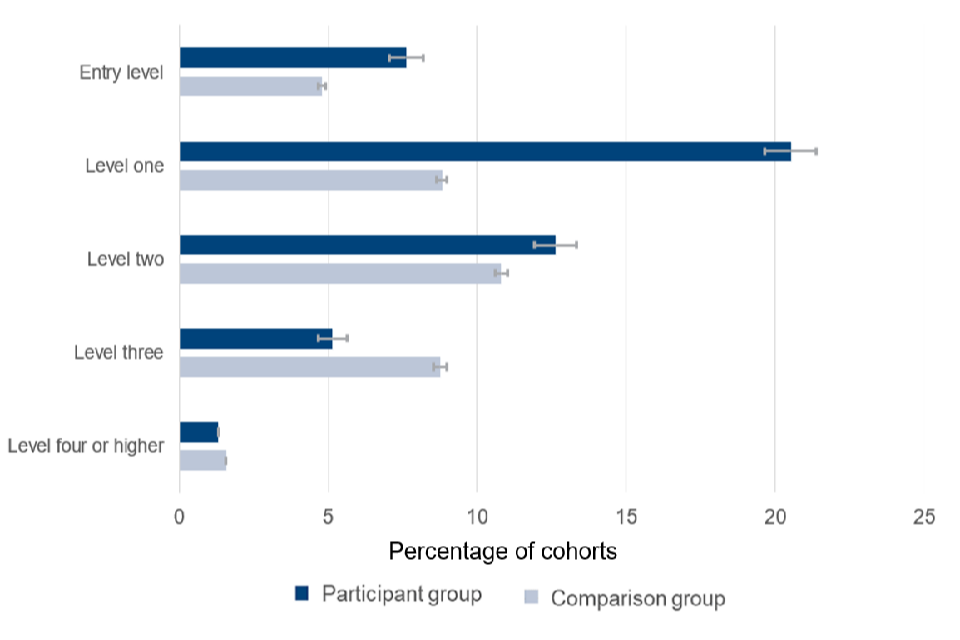 The percentage of participants who passed an education or training course at any point in the twelve months after programme start was between 5 and 9 percentage points greater than it would have been had they not participated.