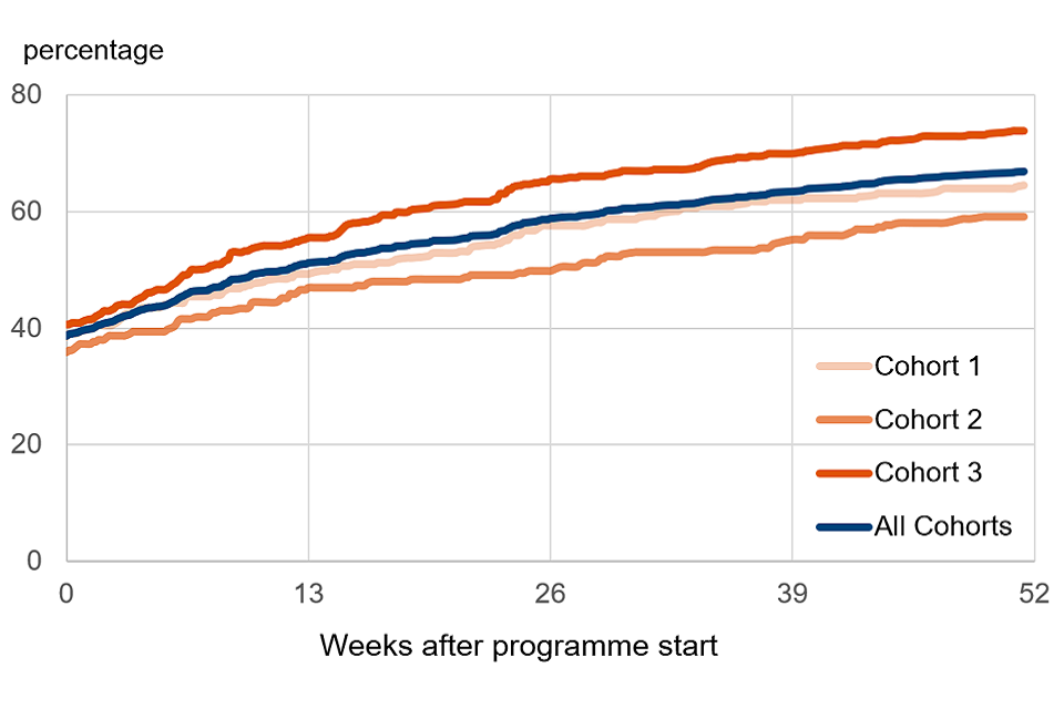 Figure 5 shows the percentage of people who have entered their first employment spell (lasting more than five days) during the 52 weeks after starting the programme. It shows that people in the last cohort (cohort 3) appear to be finding work faster than the other two cohorts.