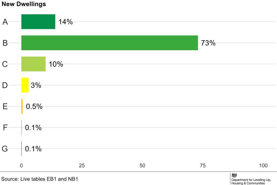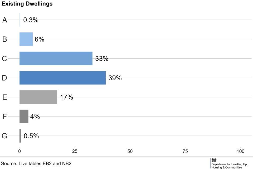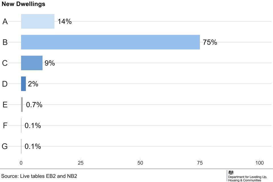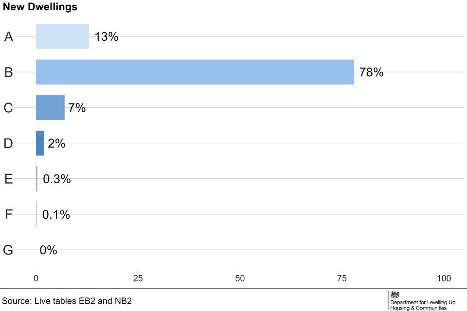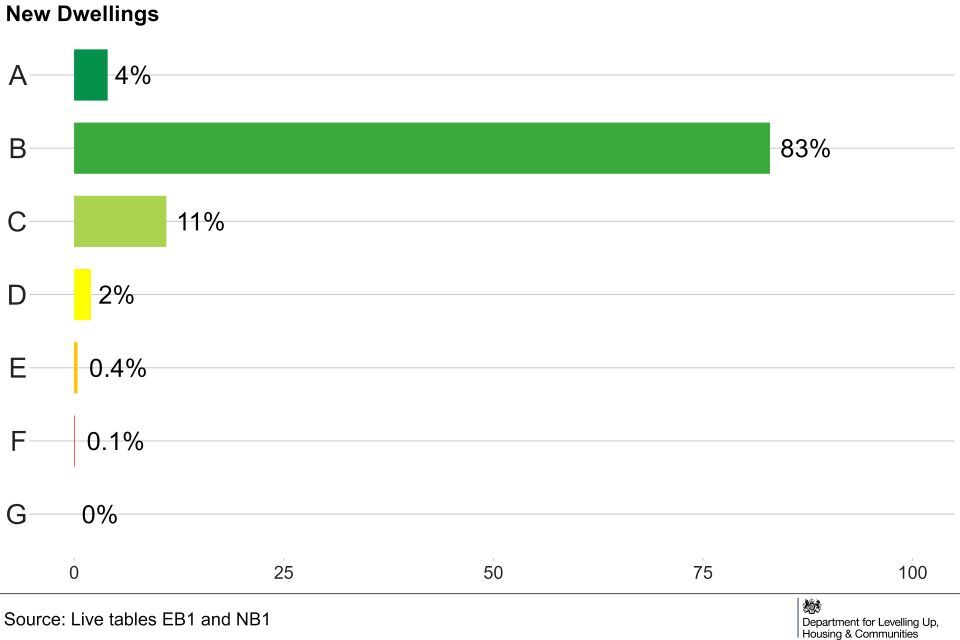 In England, from April to June 2023, most (83%) new properties were given a B EER rating. Existing dwellings were more likely to be given a C or D EER (85%), compared to 13% of new dwellings. (Live Tables EB1 and NB1).