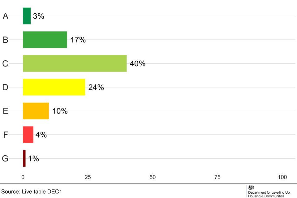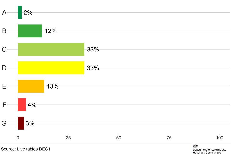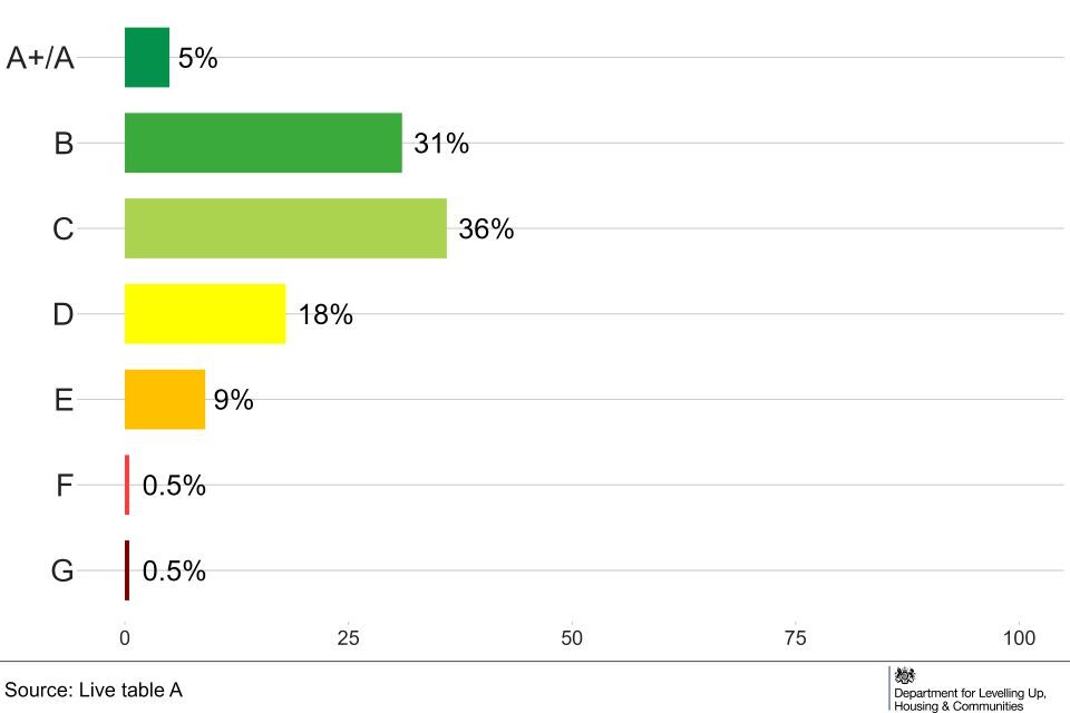 The distribution by EPC band is shown in Figure 3. Non-domestic buildings have an additional A+ band but numbers are too small to report so are combined with those receiving an A rating. An A+, A or B rating was given to 36% of properties (Live Table A).