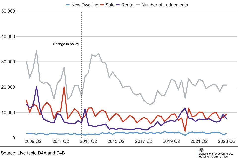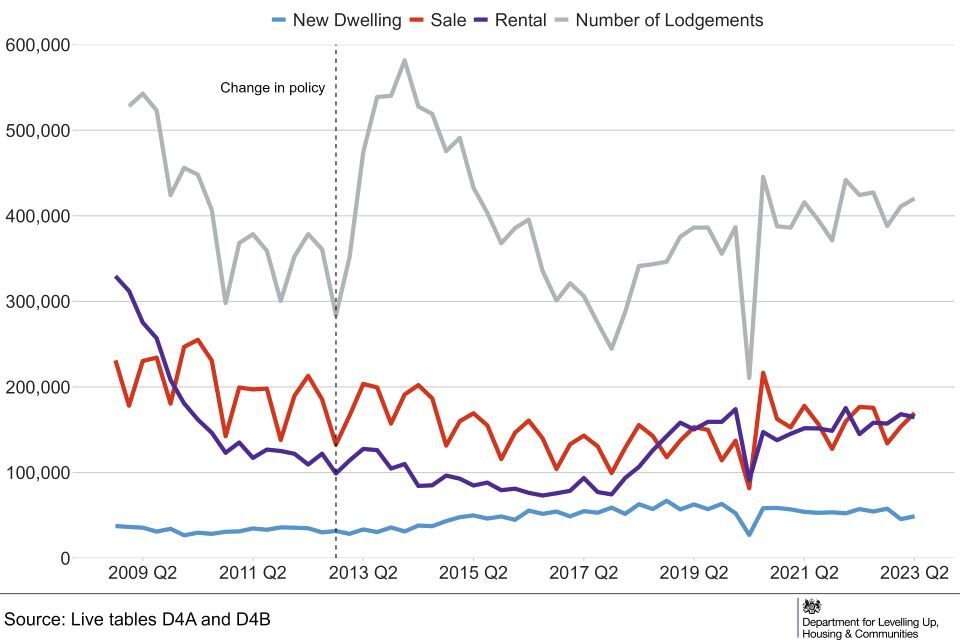 From April to June 2023, 420,000 EPCs were lodged on the Register covering all domestic dwellings (sales, lets and new dwellings) in England. This represents a 1% decrease on the same Quarter 2022, when there were 424,000 domestic lodgements (Live Table D1).