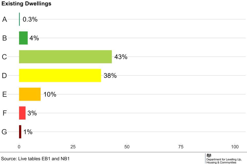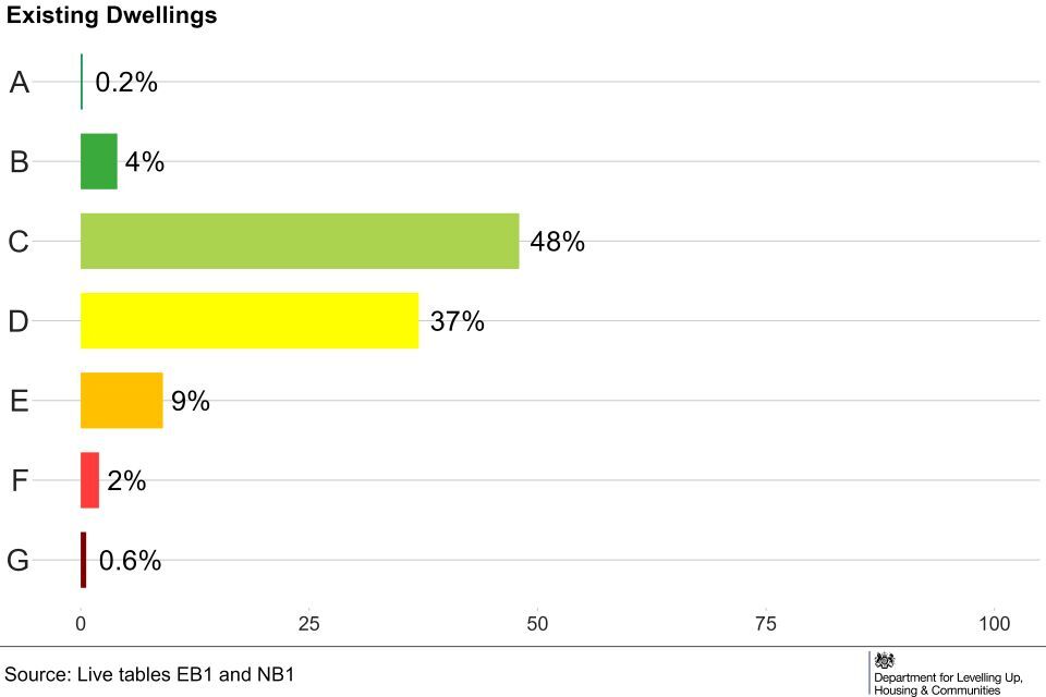 Bar chart of the percentage of existing dwellings in England with A to G energy efficiency ratings (EER) in quarter 1 2023
