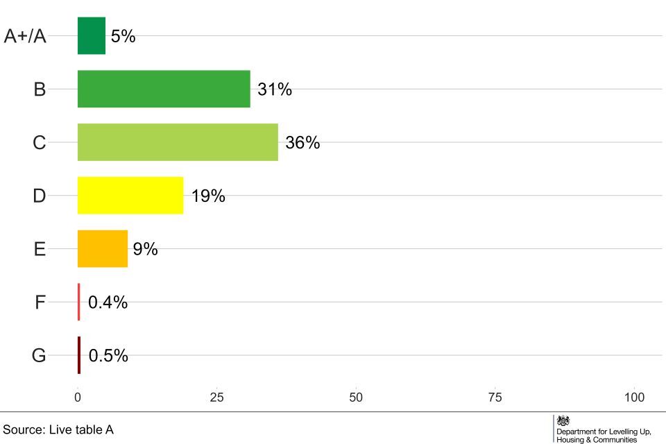 The distribution by EPC band is shown in Figure 3. Non-domestic buildings have an additional A+ band but numbers are too small to report so are combined with those receiving an A rating. An A+, A or B rating was given to 35% of properties (Live Table A).