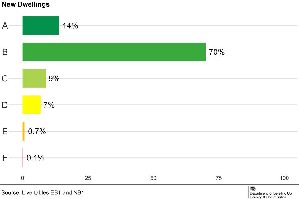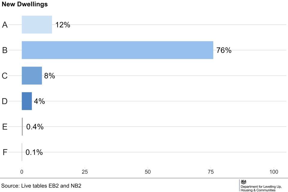From January to March 2023, 84% of new domestic properties received an energy efficiency rating of A (the highest) or B, whilst 16% received a rating of C or D.
