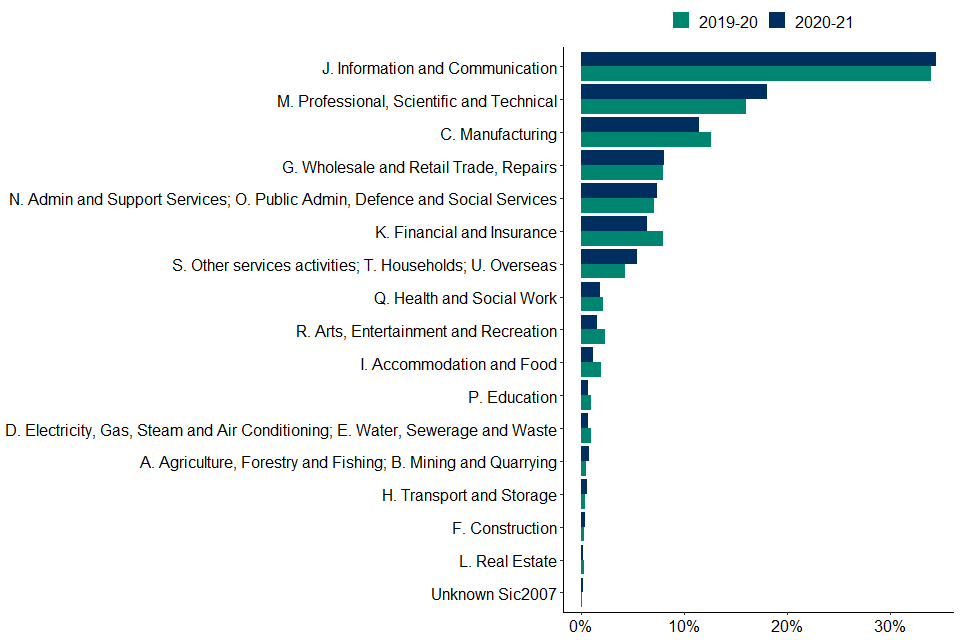 In 2020 to 2021, companies from the Information and Communication sector accounted for £72 million (41% of all SEIS investment).