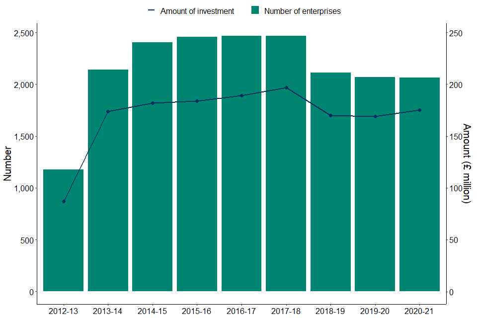 In 2020 to 2021, the number of companies raising investment under SEIS remained consistent at 2,065, compared to 2,070 in the previous year. However, the amount raised by these companies slightly increased by 4% to £175 million compared to £169 million in the previous year.