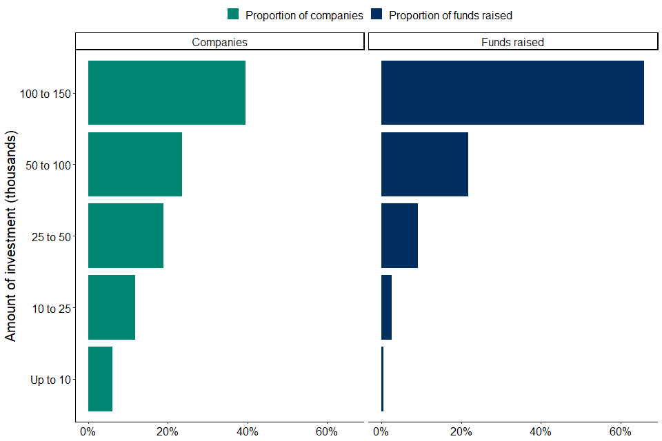 Most companies receive investments of over £50,000 through the SEIS (64% in 2020 to 2021). In 2020 to 2021, around 39% of companies raised amounts over £100,000, compared to 36% in 2019 to 2020.