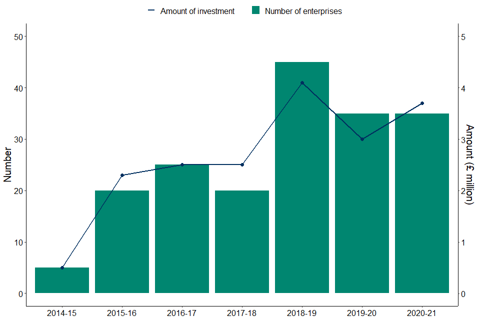 In 2020 to 2021, 35 social enterprises received investment through the Social Investment Tax Relief (SITR) scheme and £3.7 million of funds were raised. Funds are raised through equity investment (shares) and debt investment (loans). Funding has remained consistent with the previous year, where 35 social enterprises raised £3 million.
