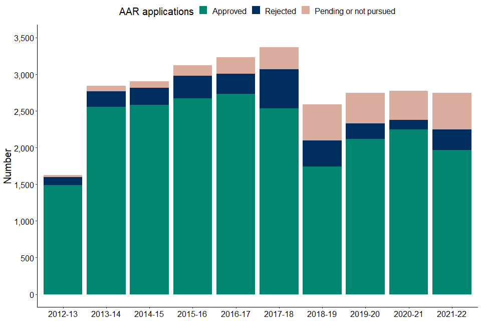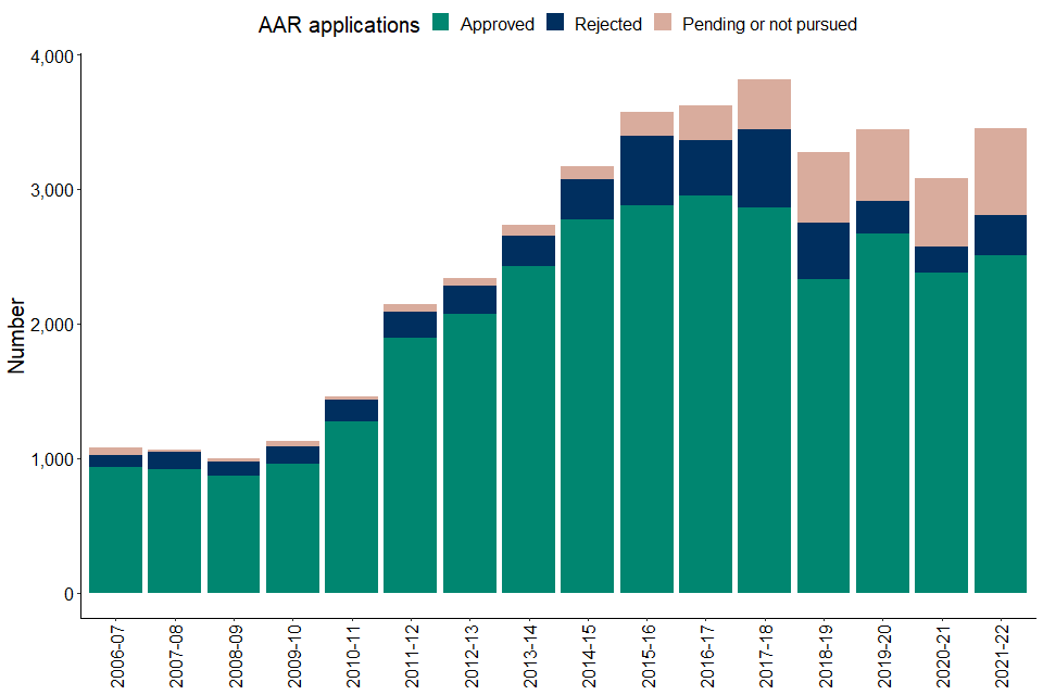 In 2017 to 2018, there was a decrease in the number of AAR applications. The reduction in applications likely reflects changes in the SITR rules which took effect from 6 April 2017.