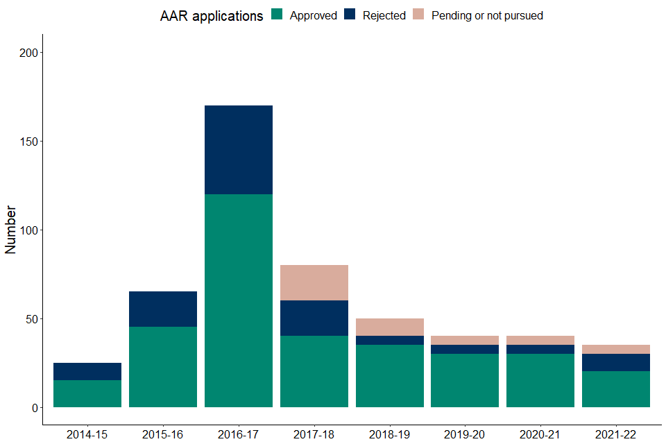 In 2020 to 2021, there were 40 SITR AAR applications and, of these 30 (72%) have been approved.