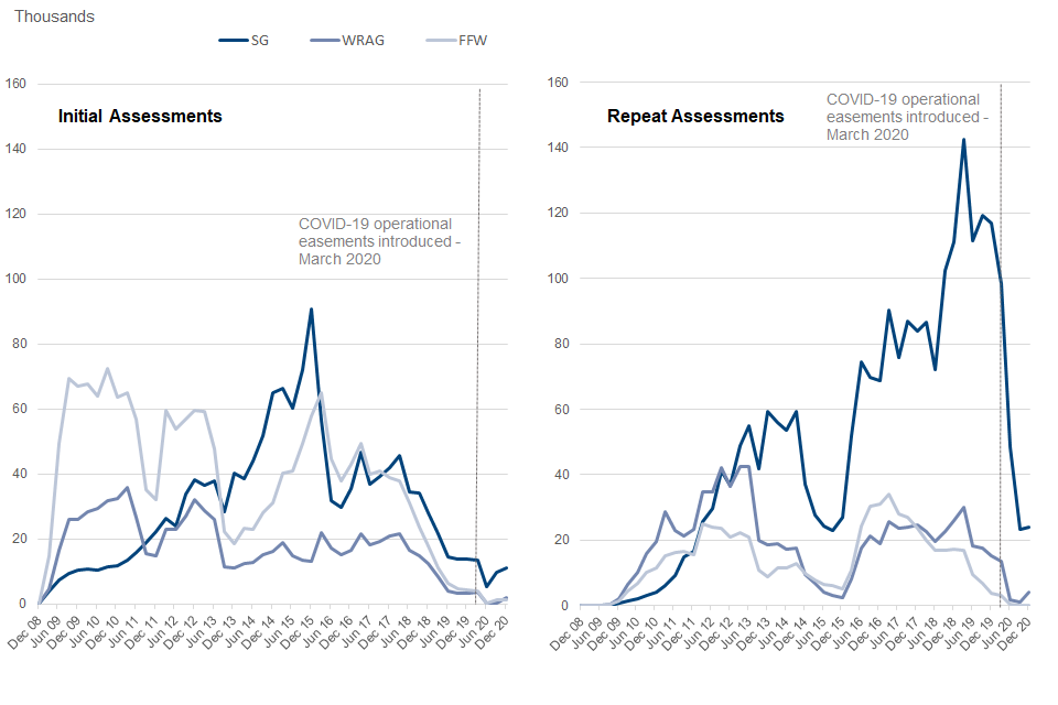 Since December 2018 when UC replaced most income-related new claims to ESA there has been a fall in the number of initial assessments required. This, together with the suspension of face-to-face assessments in March 2020 in response to the COVID-19 pandemic, has resulted in an overall downward trend in numbers of completed assessments. The quarter to December 2020 recorded 43,000 completed assessments, a slight increase (18%) when compared to the previous quarter. From September 2020 WRAG allocations could also be made via telephone assessment, which may start to have an effect on the number of completed assessments.