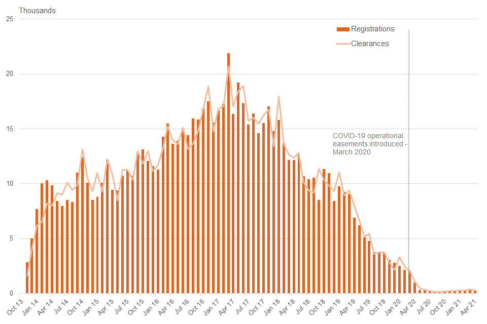By the end of April 2021, a total of 850,000 MRs have been registered. Of these, 99.6% had been cleared. The number of MR registrations and clearances within each month fluctuate over time: