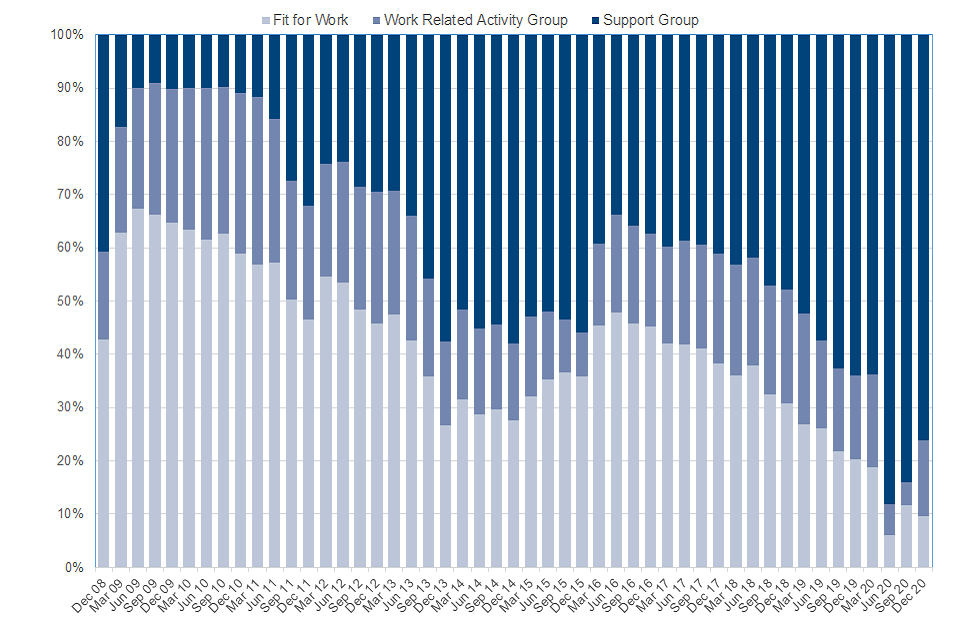 Outcomes for initial WCAs for the latest quarter to December 2020 show the majority (76%) resulted in a Support Group (SG) placement, followed by 14% to Work Related Activity Group (WRAG) and 10% Fit for Work (FfW)