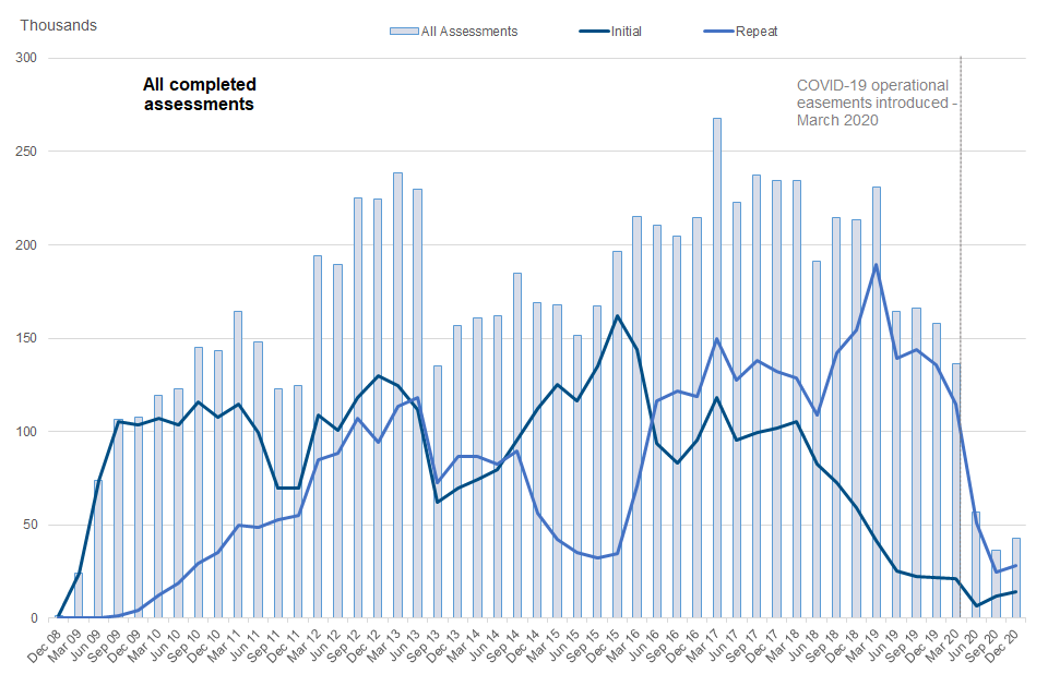 The remaining 34% of completed assessments were initial assessments. Numbers of initial WCAs have been falling over the last couple of years, however the latest quarter to December 2020 saw a slight increase from 12,000 to 14,000. The overall decreasing trend in the number of initial assessments in recent years can be attributed to UC replacing most income-related new claims to ESA from December 2018 following the national rollout.