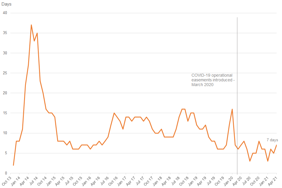 The median MR clearance time increased slightly to 7 days in April 2021.