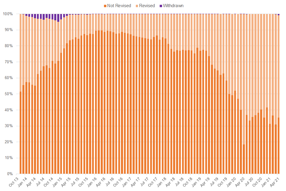 The increase in the proportion of revised decisions since 2019 should be seen in context with the large reduction in MRs, the new operational approaches to gather additional oral and written evidence at the MR stage, as well as the changing composition of WCA decisions influenced by a number of factors. These include the COVID-19 pandemic and the introduction of UC replacing most income-related new claims to ESA.