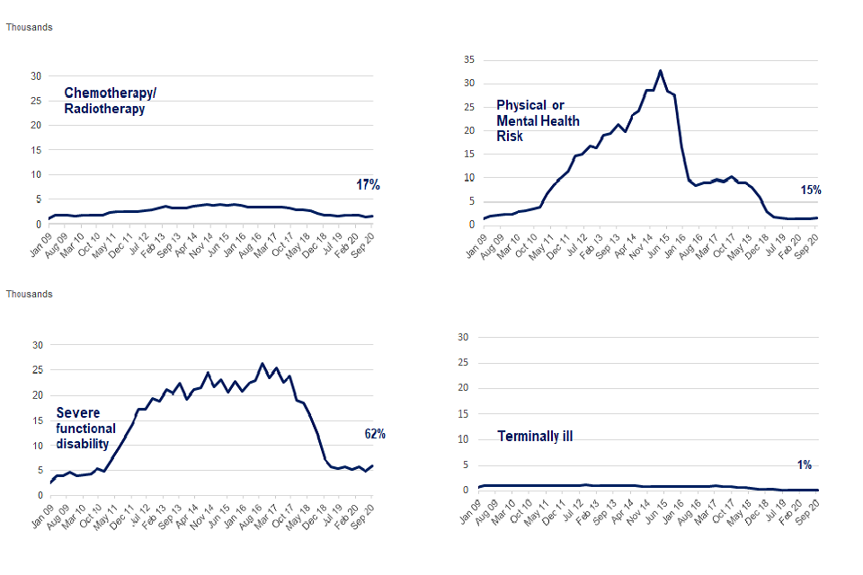 ‘Terminally ill’ numbers remained relatively low, accounting for just 1% of SG assignment reasons for claims started in the quarter to September 2020.