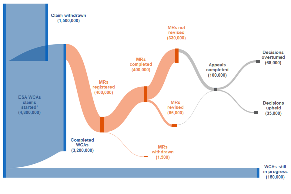 For the purpose of these statistics, we consider all reconsiderations occurring after the WCA are counted as MRs. For more information on what we have counted as an MR see section 10 of this release and the methodology note .