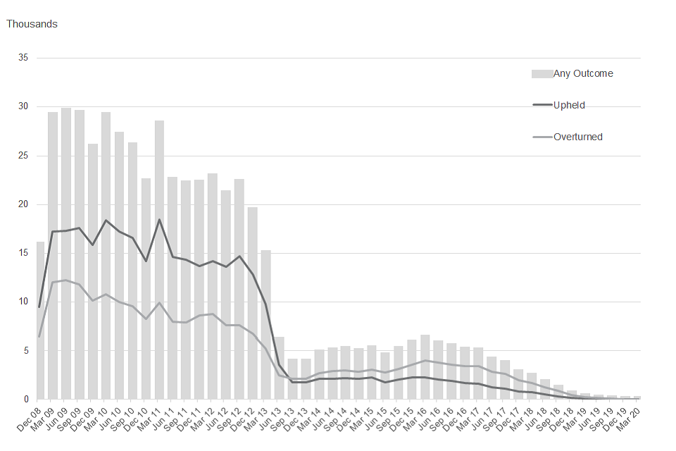 There were very few appeal outcomes for claims that started in the latest three quarters to March 2020. The low numbers may be partly due to the decrease in FfW decisions, and an increase in MR revision rates since late 2019, which are likely to affect the number of claimants going on to appeal.