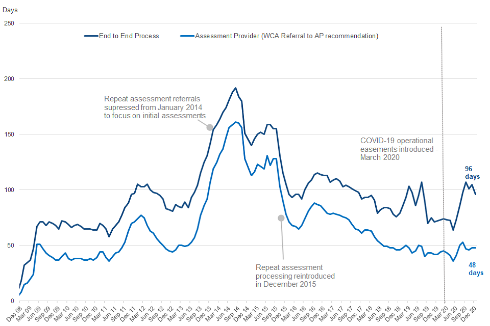 After 2008, the median end-to-end clearance time generally followed an upward trend, reaching a peak of 192 calendar days in August 2014. Since then, it has reduced considerably to 93 days in February 2016 and 79 days in December 2018. The end-to-end clearance time saw sharp increases in early 2019 (103 days in March 2019 and 107 in July 2019), to fall again to 70 days in September 2019. In the month to December 2020, the end-to-end median clearance times (claim registration to final DWP award decision) for initial claims decreased from 107 (in September 2020) to reach 96 calendar days. .