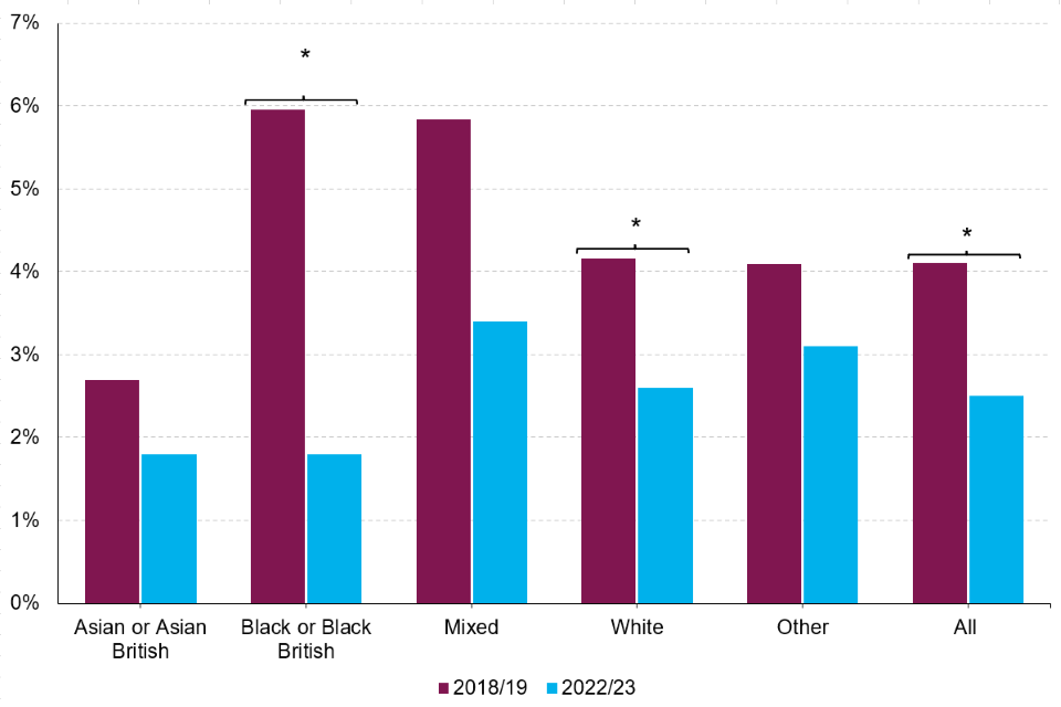 There were statistically significant decreases in the prevalence of personal crimes since 2018/19 in the black (from 6.0 to 1.8%) and white (from 4.2 to 2.6%) ethnic groups.