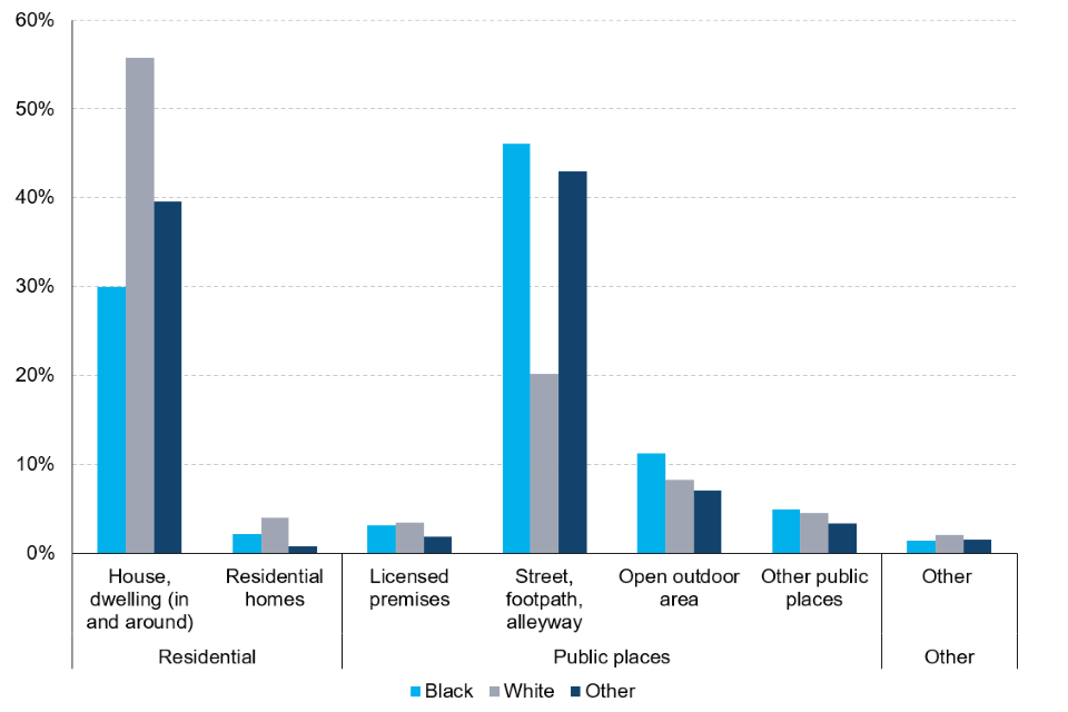 | Between 2019/20 and 2021/22, a third of black homicide victims were aged 20 or younger. | This compares to 13% of white victims and 25% of victims from the other ethnic group. |