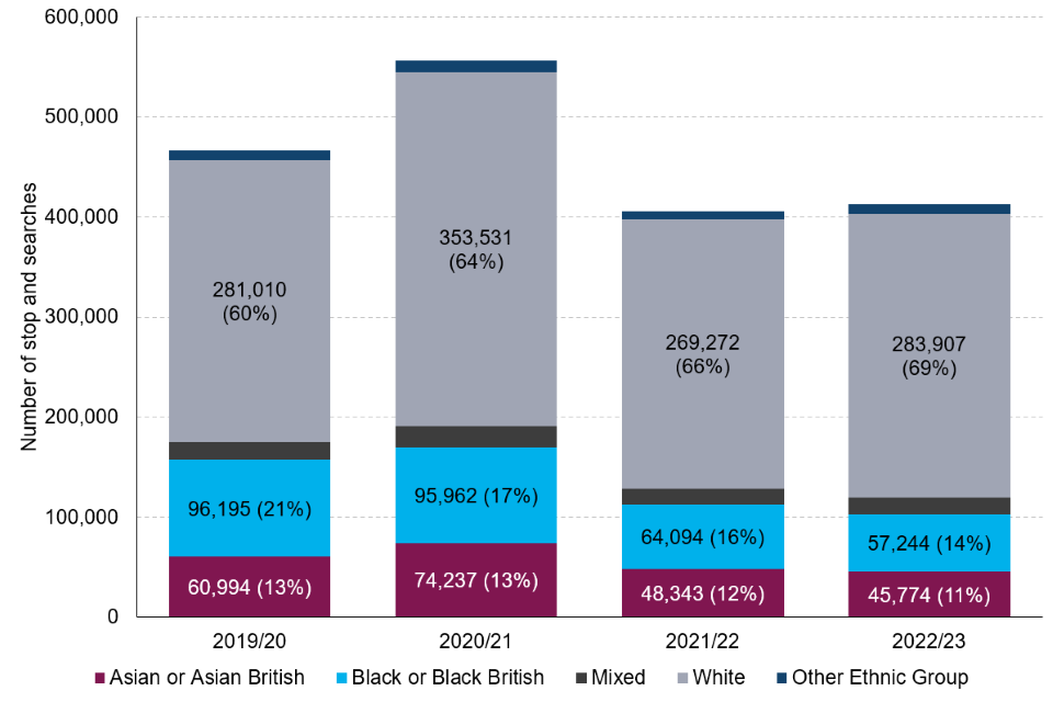 | Between 2019/20 and 2022/23, the proportion of stop and searches for people from the white ethnic group increased from 60% to 69%. | Over this period, there were corresponding decreases in proportions accounted for by black individuals (21% to 14%) and Asian individuals (13% to 11%). |