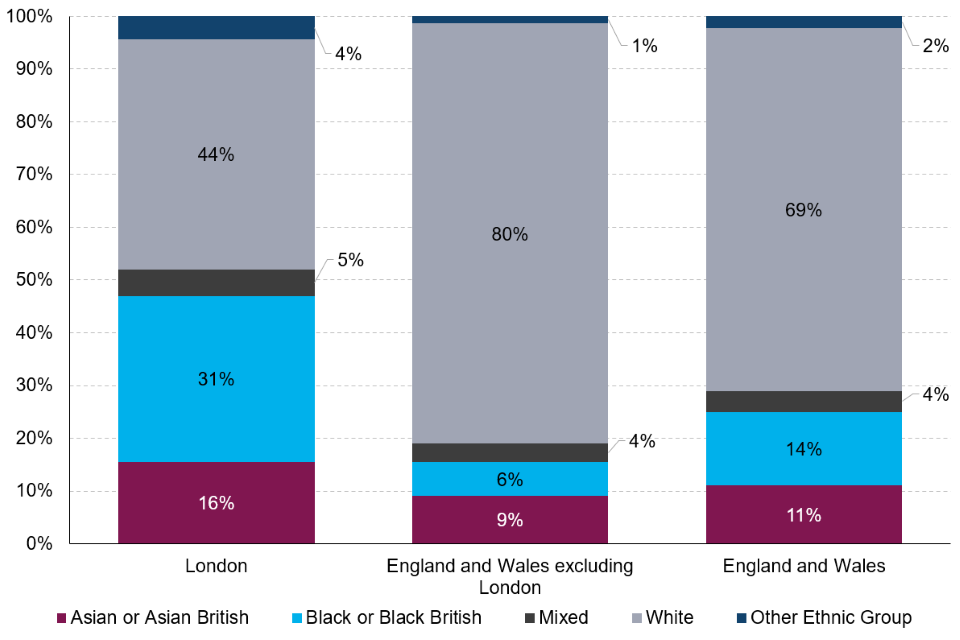| In 2022/23, 69% of children arrested in London were from ethnic minorities (excluding white minorities) | A larger proportion of arrests in London were for individuals from ethnic minorities (excluding white minorities), at 56%, compared to 17% across the rest of England and Wales. |