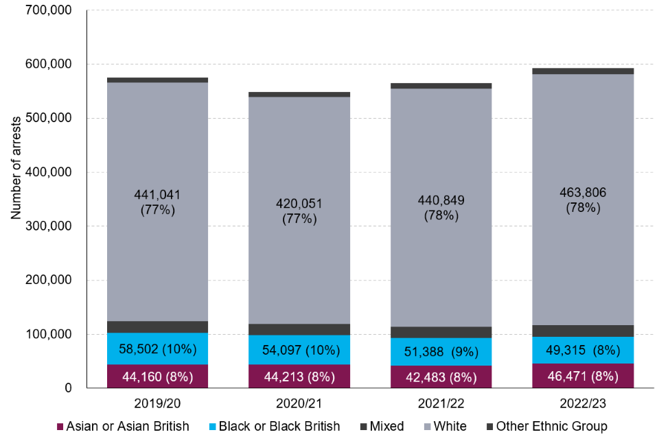 | In 2022/23, white individuals accounted for 78% of arrests, 8% were of black individuals, 8% were of Asian individuals, 4% were of mixed ethnicity individuals and 2% were of other ethnicity individuals. | Relative proportions of arrests across ethnic groups remained relatively stable between 2019/20 and 2022/23, with a slight increase in the proportion of individuals from the white group and corresponding decrease in those from the black ethnic group. |