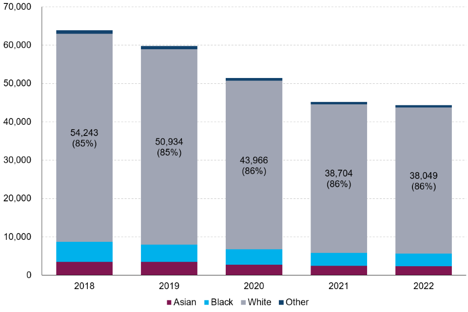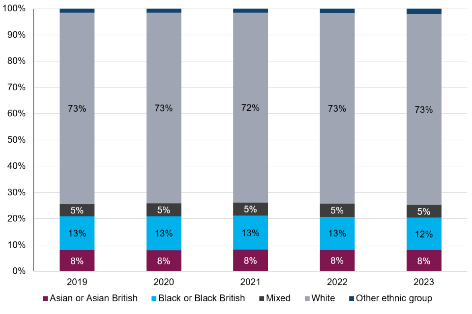 Data are self-declared from Home Office, as at March 2023 where ethnicity was known, some small discrepancies may result from revisions of data for previous years compared to figures here. Ethnicity was not stated in 3% of records in 2023. ↩